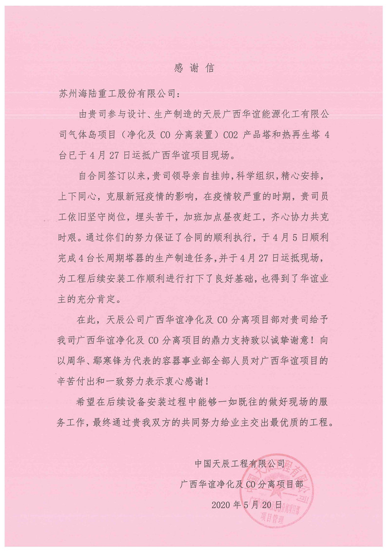 海陸重工有幸承制了此項目中的氣體島(凈化及CO分離裝置)CO2產品塔和熱再生塔產品。在今年四月份的時候,我們收到了一封來自客戶的感謝信。信中說:“天辰公司廣西華誼凈化及CO分離項目部對貴司給予我司廣西華誼凈化及CO分離項目的鼎力支持致以誠摯的謝意!”